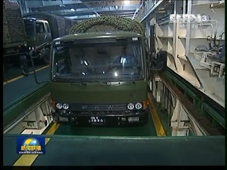 CCTV Reported a military exercise involving Yue Hai Tie 2, a railroad car RoRo, pressed into military server in Hainan Island.