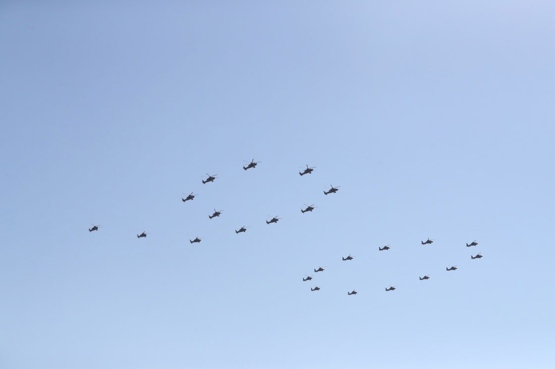 Forty-one helicopters flew in two formations that spelt the Chinese characters of "Ba Yi" -- which mean the date Aug. 1 -- and the number "90."